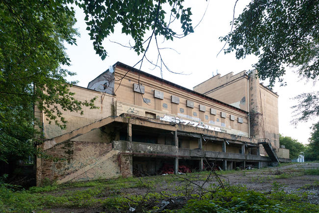 В качестве восклицательного знака в конце нашего маршрута — один из шести знаменитых клубов Мельникова, наверное, самый известный. Профсоюз коммунальщиков, заказавший архитектору клуб, получил манифест — здание-рупор. В вершине треугольника, положенного в план — сцена, в середине — партер, а основание разделено на три амфитеатра, вынесенных на фасад в виде нависающих консолей. Как и все остальные клубы Мельникова, этот проект задумывался как трансформер: при помощи опускающихся стен амфитеатры могли отъединяться от зала и служить тремя отдельными аудиториями для собраний. Интерьеры клуба были в основном белыми, но в некоторых местах расписаны супрематическими композициями из цветных треугольников и квадратов; фойе второго этажа было выкрашено в ярко изумрудный цвет. Здание критиковали с самого начала как экспрессионистическое, носящее черты «надорванности, мистичности», а к середине 1930-х оно стало одной из главных мишеней в развернувшейся травле Мельникова. Авторы критических статей писали о «безобразных бетонных опухолях» на фасаде и о том, что, находясь внутри амфитеатра, они все время ожидают его обрушения. Значительный перевес театральных помещений относительно всех остальных функций клуба привел к тому, что в итоге здесь поселился театр.