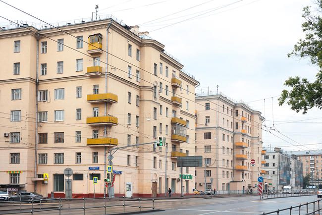 Чуть дальше, по левую сторону — первые реализованные в Москве постройки Бориса Иофана: показательные жилые дома для рабочих, спроектированные им после возвращения из Италии. Этот комплекс вполне можно назвать усадьбой — именно так в 1925 году Иофану виделось идеальное пространство для советского человека: зеленый курдонер, обстроенный по периметру трехэтажными домами с глубокими лоджиями (чтобы спасаться, вероятно, от итальянского солнца), многочисленные арки, круглые балкончики, неожиданные для той эпохи классицистические вертикальные высокие окна. Наверное, это один из самых камерных и тонких жилых кварталов эпохи авангарда в Москве.