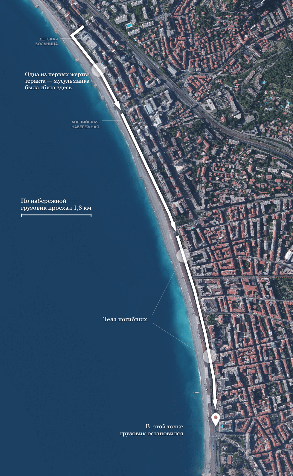 Вечером 14 июля, в День взятия Бастилии, на Английскую набережную в Ницце, заполненную людьми, выехал грузовик. Автомобиль врезался в толпу и проехал по набережной почти два километра. В результате погибли как минимум 84 человека, более 100 получили ранения. «Медуза» со ссылкой на данные The New York Times показывает, как двигался грузовик по набережной.