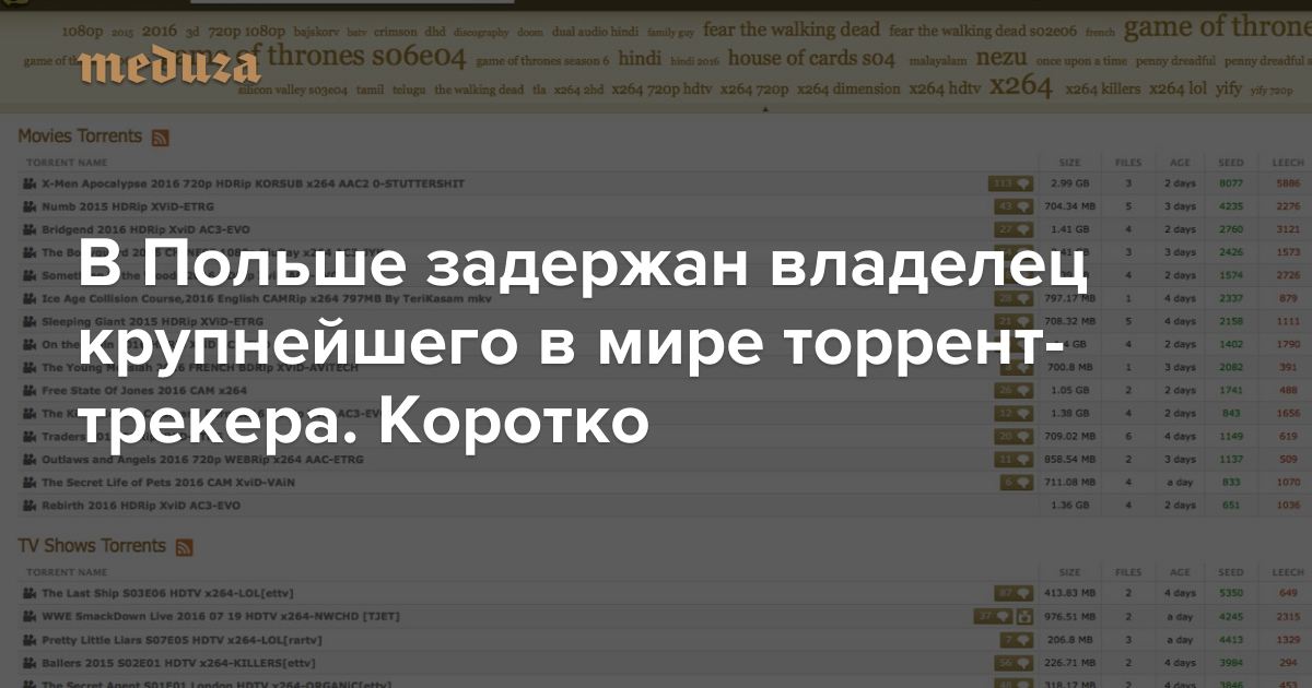 В Польше задержан владелец крупнейшего в мире торрент-трекера KickassTorrents (KAT). Им оказался 30-летний гражданин Украины Артем Ваулин. Операция проводилась по требованию властей США. В Америке Ваулина подозревают в нарушении авторских прав и отмывании денег — ущерб от его деятельности составил больше миллиарда долларов. «Медуза» рассказывает главное о задержании Ваулина.