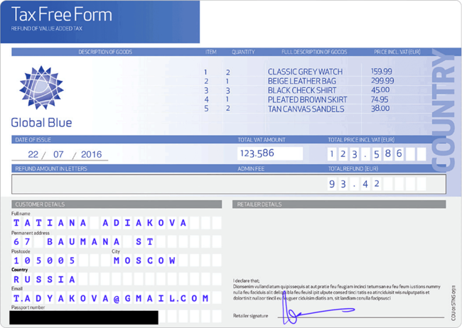 Магазинам нужно объяснить государству, почему с вашей покупки не поступил налог в бюджет. Поэтому вместе с чеком вы получаете от сотрудника магазина специальную заявку на такс-фри. Вы (но чаще всего — продавец) заполняете заявку, продавец или кассир расписывается и оставляет себе копию.