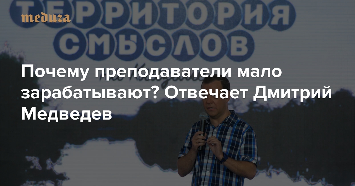 На форуме «Территория смыслов» премьер-министра Дмитрия Медведева спросили, почему молодые учителя и преподаватели в Дагестане получают 10-15 тысяч рублей, а полицейские — от 50 тысяч. Медведев ответил. «Медуза» максимально коротко пересказывает ответ премьер-министра (и приводит его полную версию).