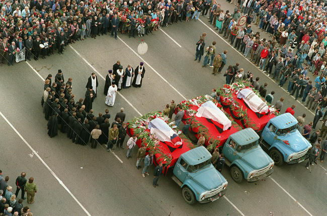 Похороны демонстрантов, погибших в столкновениях с военными в центре Москвы. 24 августа 1991 года. 37-летний Владимир Усов, 28-летний Илья Кричевский и 22-летний Дмитрий Комарь были посмертно награждены званием Героя Советского Союза.