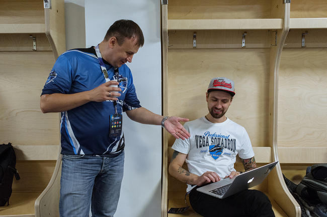 Когда игра начинается, команда полностью концентрируется на происходящем на экране. Иногда посмотреть на то, что делают игроки, в тренировочный зал заходит Алексей Кондаков, владелец Vega Squadron. Игроки называют его просто — Босс.