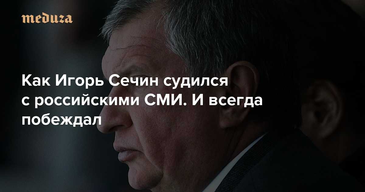 Игорь Сечин — один из самых влиятельных людей в России; его считают человеком, близким к президенту Владимиру Путину. С 2012 года Сечин возглавляет государственную нефтяную компанию «Роснефть». В 2014-м пресс-секретарем компании стал телеведущий Михаил Леонтьев, после чего Сечин начал регулярно судиться с российскими СМИ — из-за публикаций о себе и своей компании. На этой неделе «Роснефть» подала иск к холдингу РБК на рекордную сумму — три миллиарда рублей. «Медуза» рассказывает, как Игорь Сечин побеждал российские медиа в судах.