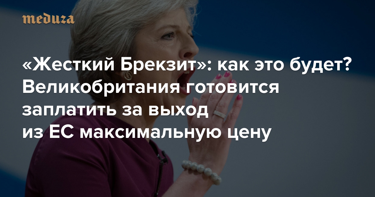 Премьер-министр Великобритании Тереза Мэй на съезде Консервативной партии заявила, что государство подаст заявление о выходе из Евросоюза не позднее марта 2017 года и готово полностью выйти из единого торгового пространства ЕС, если это потребуется. По оценке казначейства Великобритании, такой сценарий будет стоить стране 73 миллиардов евро ежегодно. Фактически, Мэй не исключает варианта «жесткого Брекзита» — максимально неблагоприятного для Соединенного Королевства способа развода с Евросоюзом. «Медуза» рассказывает, что означает «жесткий Брекзит».