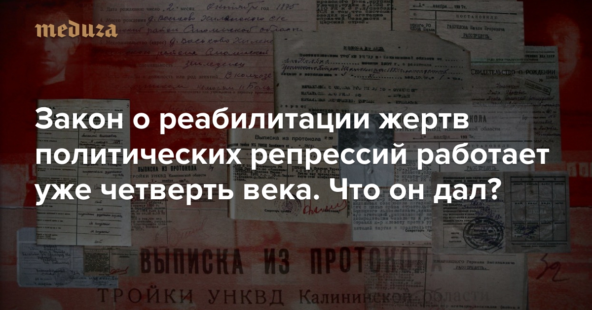 — Еще одна важная проблема состояла в том, что формулировка понятия «политические репрессии» была недостаточно полной. Были, например, жестокие наказание за кражи колосков (речь идет о применении указа от 7 августа 1932 года, т. н. законе «О трех колосках», по которому осужденных за небольшие кражи общественного имущества расстреливали или приговаривали к длительным лагерным срокам — прим. «Медузы»). При этом само преступление квалифицировалось как кража. Люди, чье хозяйство разорили, — их считать жертвами политических репрессий или нет? Вот это тоже в законе сомнительным осталось. Для меня очевидно, что они жертвы, но прямого указания [в законе] вроде как нет. Значит, для этого нужно какое-то судебное толкование, чтобы их подвести под эту категорию.