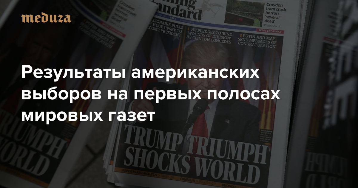 9 ноября стало известно, что в выборах президента США, вопреки большинству прогнозов, победил Дональд Трамп. «Медуза» посмотрела, как отреагировали на главное политическое событие года ведущие мировые газеты (многие из которых последовательно критиковали кандидата от Республиканской партии).