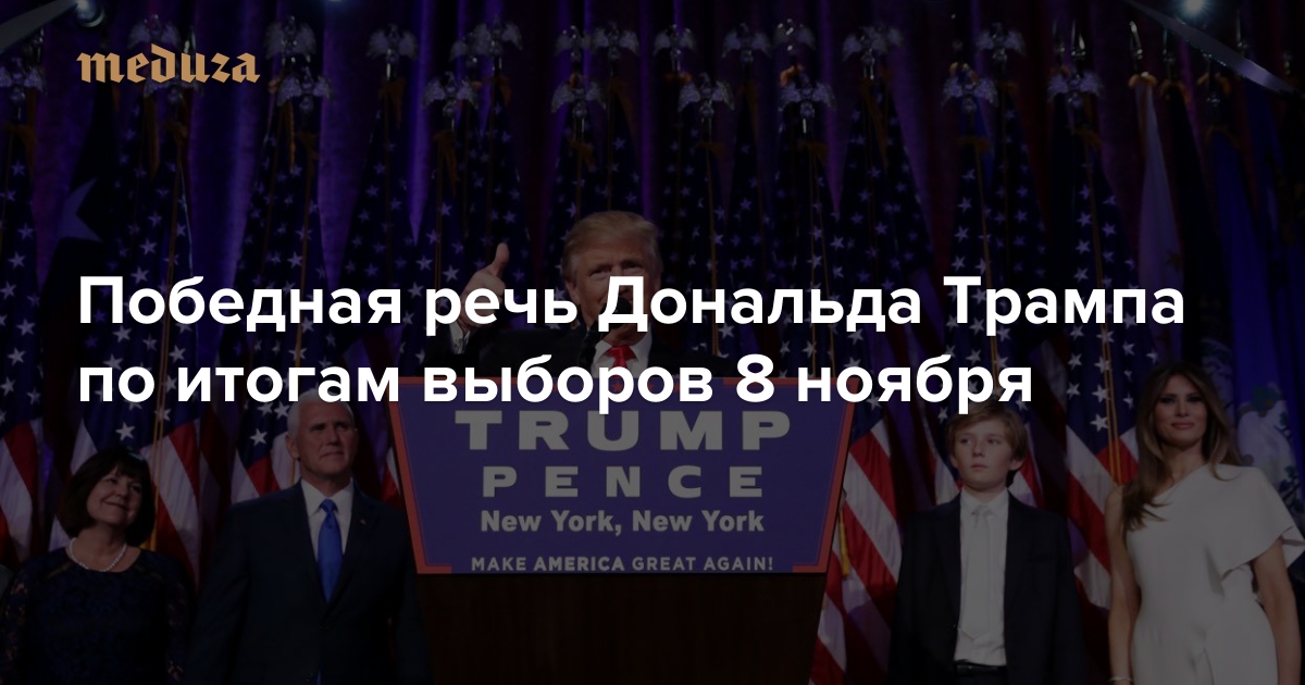 На выборах президента США победил республиканец Дональд Трамп. После оглашения предварительных результатов кандидат, который на протяжении всей кампании раздражал истеблишмент скандальными высказываниями, выступил с речью об объединении страны. «Медуза» публикует перевод примирительной речи Трампа с незначительными сокращениями.