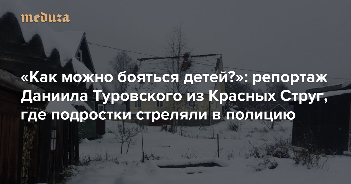 14 ноября двое убежавших из дома подростков в селе Струги Красные Псковской области заперлись в частном доме и стреляли из него — то просто в воздух, то по полицейской машине. Параллельно они вели видеотрансляцию происходящего. Дом был блокирован, полиция начала штурм. После него правоохранительные органы объявили, что подростки покончили жизнь самоубийством. Спецкор «Медузы» Даниил Туровский отправился в поселок, чтобы узнать, что там произошло.