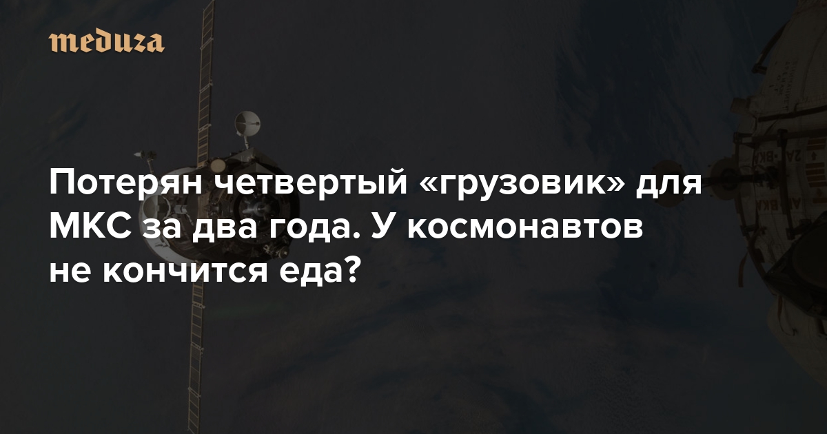 1 декабря был потерян космический грузовик «Прогресс МС-04»: аппарат перестал передавать данные на седьмой минуте полета и через несколько часов разрушился в плотных слоях атмосферы. Это вторая потеря «Прогресса» и уже четвертый грузовик, не долетевший до МКС, за последние два года. «Медуза» рассказывает, как устроено снабжение космонавтов на международной станции и почему без еды ее экипаж не останется.