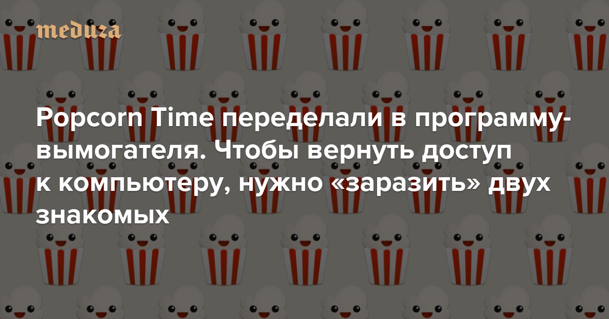 Поделись с другом Popcorn Time переделали в программу-вымогателя. Чтобы вернуть доступ к компьютеру, нужно «заразить» двух знакомых