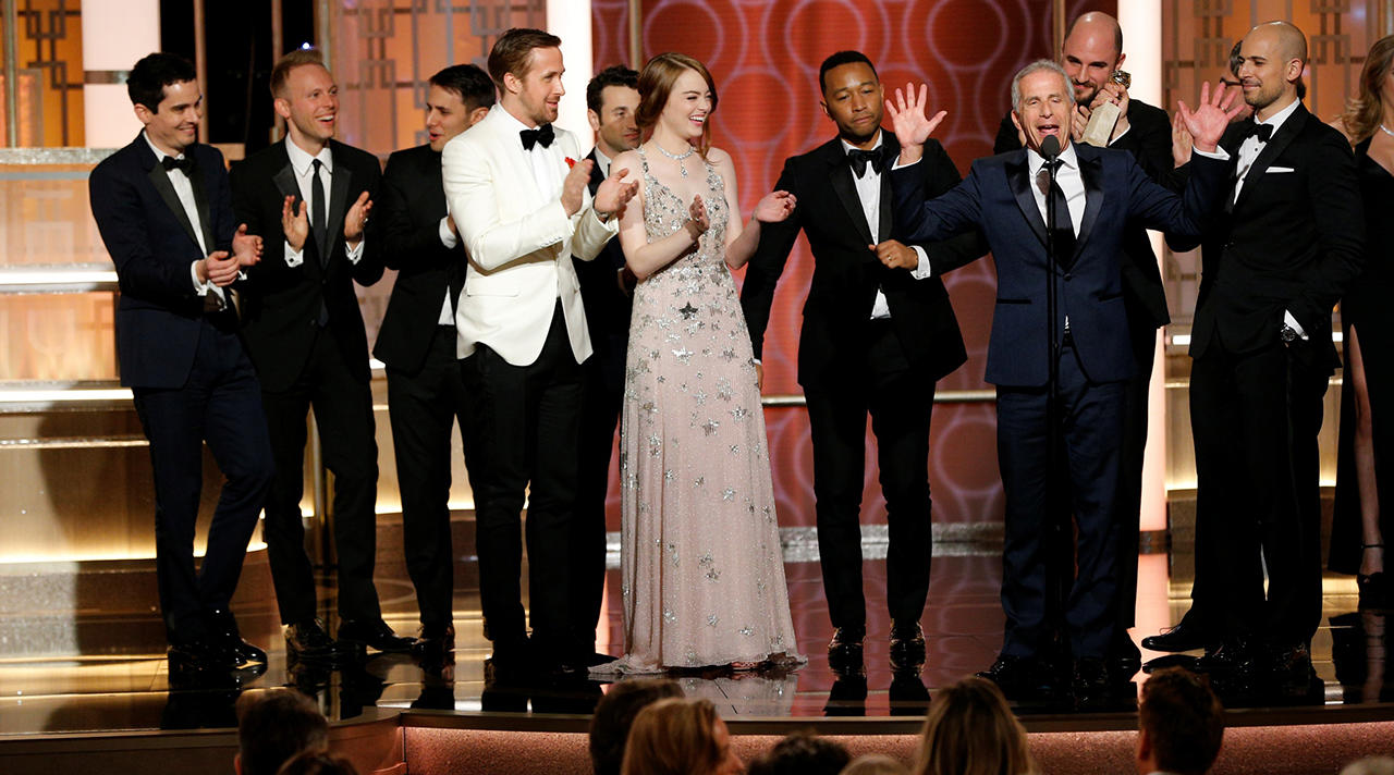 «Ла-Ла Ленд» завоевал 7 статуэток, включая одну из главных — «Лучшая комедия или мюзикл». Это абсолютный рекорд за всю историю «Золотого глобуса». До триумфального мюзикла Дэмьена Шазелла больше всего «Глобусов» (6) получили фильмы «Пролетая над гнездом кукушки» Милоша Формана и «Полуночный экспресс» Алана Паркера. Сам Шазелл тоже установил рекорд: в свои неполные 32 года он оказался самым молодым режиссером, удостоенным этой кинонаграды. Голливудская ассоциация иностранной прессы оценила и актерские работы главных звезд фильма Эммы Стоун и Райана Гослинга — они стали лучшими в своей категории, а также музыку «Ла-Ла Ленда» и его сценарий.