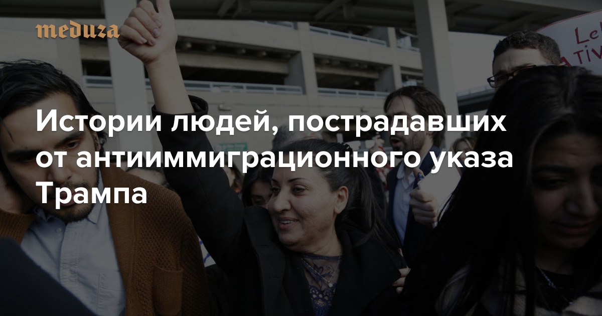 27 января 2017 года Дональд Трамп временно запретил въезд в США гражданам семи мусульманских стран — Сирии, Йемена, Ирака, Ирана, Судана, Ливии и Сомали. Трамп объясняет свой самый жесткий указ необходимостью обезопасить границы; оппоненты считают действия президента антиконституционными. В первый же день действия распоряжения в аэропортах США были задержаны почти 200 человек — в том числе обладатели виз и вида на жительство. Многие не смогли даже вылететь в Штаты. Американские СМИ опубликовали десятки историй людей, которые из-за указа Трампа не смогли приехать к родным, вернуться на работу и учебу и даже попасть домой в Европу — потому что даже пересадка в американском аэропорту для них стала проблемой. «Медуза» публикует несколько таких историй.
