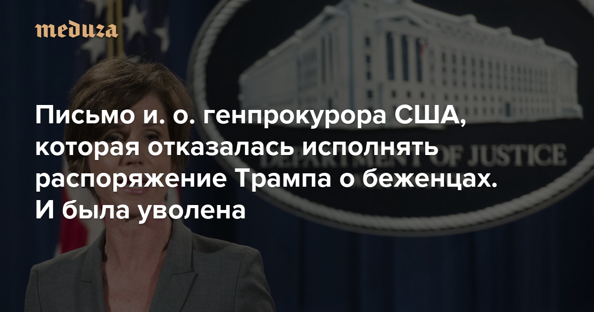 «Наша позиция в судах должна быть основана на справедливости» Письмо и. о. генпрокурора США, которая отказалась исполнять распоряжение Трампа о беженцах. И была уволена