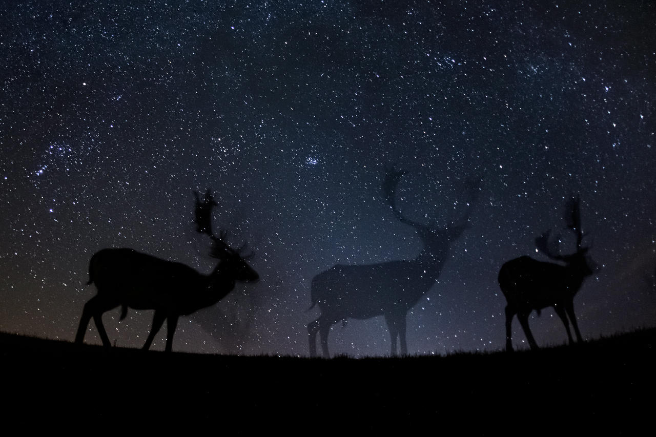 Категория «Природа», третье место в номинации «Фотоистория». Европейские лани на ночной прогулке
