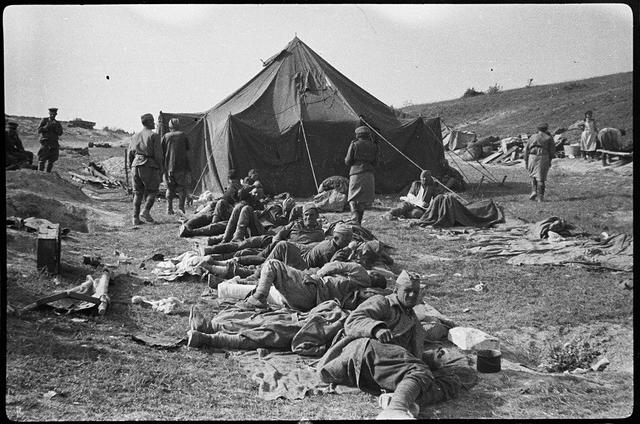 Раненые в ожидании эвакуации у пункта медицинской помощи в районе Безымянной (Федюкины высоты), 9 мая 1944 года
