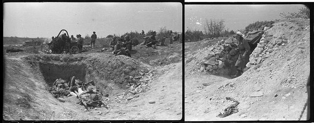 Панорама пункта медицинской помощи в районе Федюкиных высот. Слева — раненые в укрытии; справа — блиндаж санитарной роты. 9 мая 1944 года