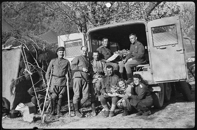 Группа работников 142-й мотострелковой бригады у машины комбата, 8 мая 1944 года
