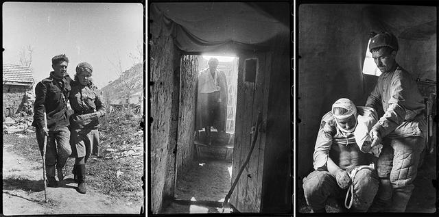 1) 4-й Украинский фронт, 51-я Армия. 216 СД. 9 мая 1944 г. ПМП 665 стр. полка в 2-х км. южнее высоты 125,7 (Федюкины высоты) Санинструктор ведет раненого на погрузку (в ПМП 1372 стр. полкав селении Верхний Чергунь).2) Апреля 1944 г. 51-я армия Сев. берег Сиваша. Подземный медсанбат — 1423) 4-й Украинский фронт, Приморская армия 4-го Украинского Фронта, МСБ-73, 77 сд. Санитар Умбат Искандеров и раненый Ф.Д. Оберемок.