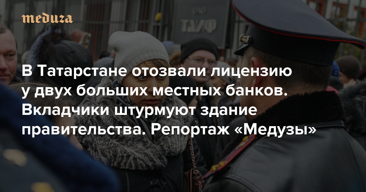 В Татарстане отозвали лицензию у двух больших местных банков. Вкладчики штурмуют здание правительства. Репортаж «Медузы»