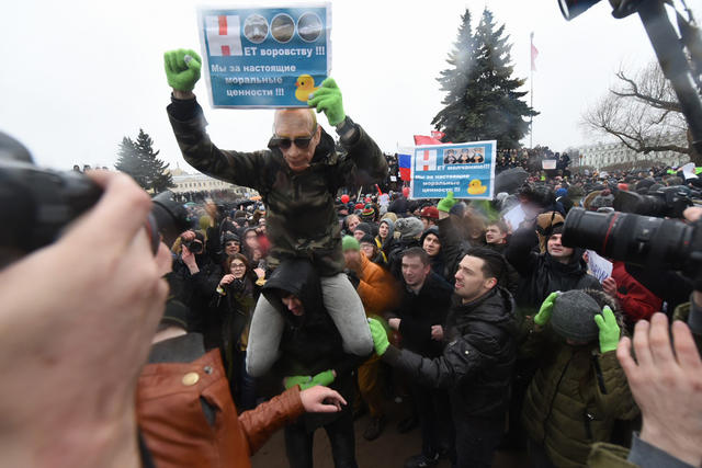 Погода в Петербурге к прогулкам 26 марта не располагала: дождь со снегом и штормовой ветер. Однако на Марсовом поле, где стартовала акция «Он вам не Димон», по разным оценкам, собралось от трех тысяч (по данным администрации Петербурга) до 10 тысяч человек (по данным очевидцев). Пересечений с теми, кто недавно на том же самом месте митинговал против передачи Исаакиевского собора Русской православной церкви, было не так уж много: на антикоррупционную акцию пришло гораздо больше молодежи.