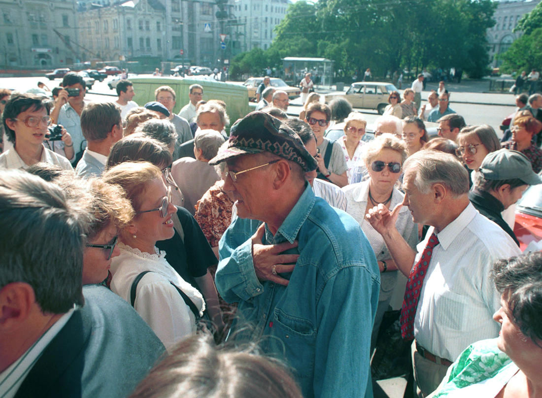 Евгений Евтушенко в Москве перед премьерой двух своих книг — «Поздние слезы» и антологии «Строфы века», 1995 год