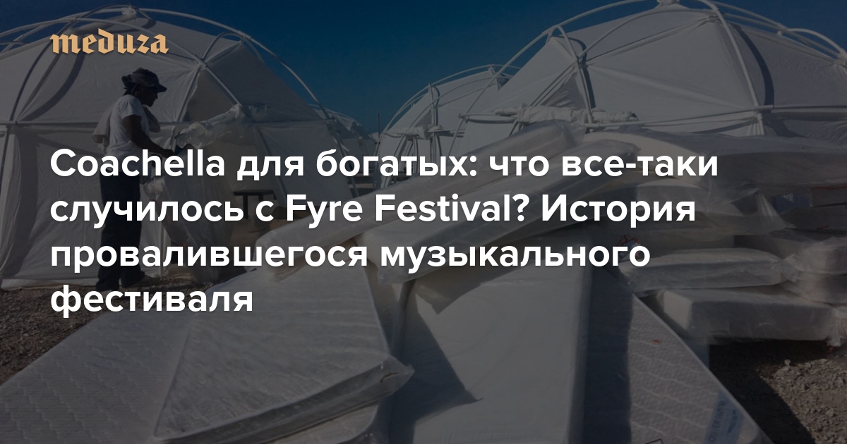 В конце апреля на Багамах должен был впервые пройти Fyre Festival, который анонсировался как уникальный опыт роскошной жизни; на Fyre Festival должны были выступить музыканты вроде Blink-182 и Major Lazer. В итоге выяснилось, что к фестивалю ничего не готово; обладатели билетов, успевшие доехать до места его проведения, обнаружили, что там нет ни еды, ни жилья, ни музыкантов, а уехать домой им никто помогать не собирается. История с Fyre Festival — самый громкий провал в музыкальной индустрии за последнее время. Американские журналисты попытались установить, как такое все-таки могло произойти. «Медуза» рассказывает о том, что они выяснили.