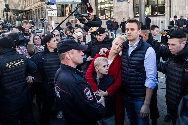 Полиция выводит с митинга политика Алексея Навального, его жену Юлию и сына Захара