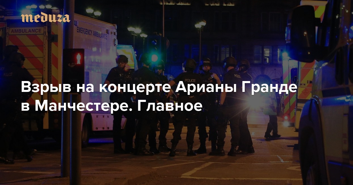 Вечером 22 мая в Манчестере на концерте американской певицы Арианы Гранде, который проходил на крытом стадионе Manchester Arena, произошел взрыв. По данным полиции, погибли по меньшей мере 22 человека, несколько десятков ранены. Власти рассматривают произошедшее как теракт. «Медуза» рассказывает, что стало известно в первые часы после случившегося.