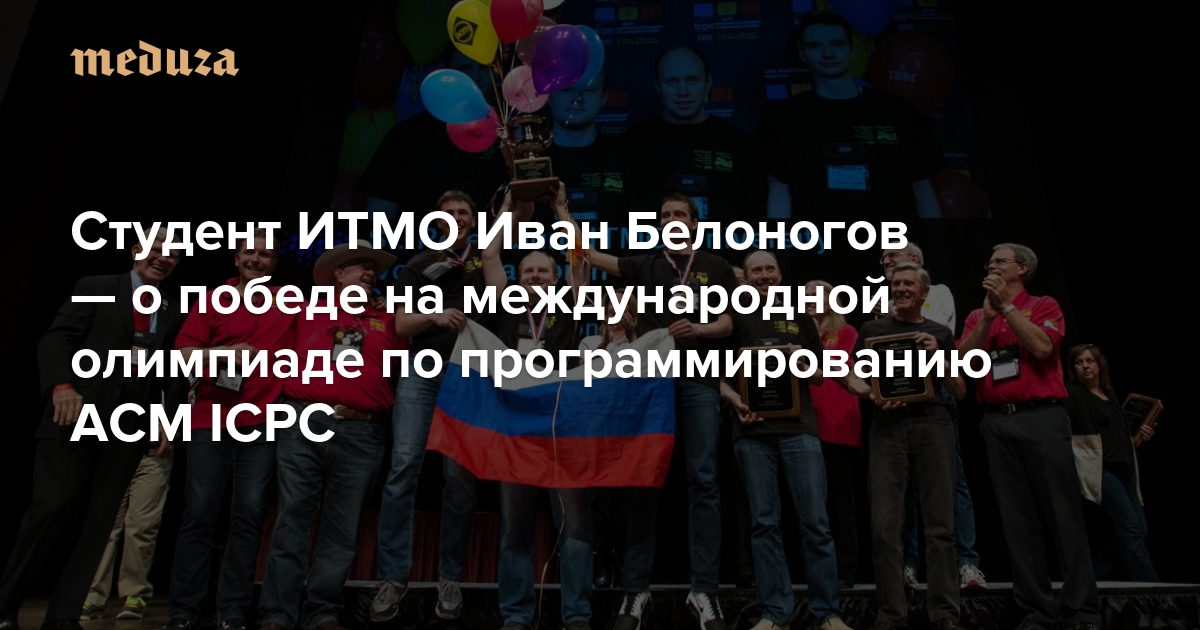 В американском городе Рапид-Сити 24 мая прошел финал международной студенческой олимпиады по программированию ACM ICPC — крупнейшей в своем роде. Все последние годы первые места на олимпиаде занимают российские студенты. 2017-й не стал исключением — победила команда Санкт-Петербургского национального исследовательского университета информационных технологий, механики и оптики (ИТМО) под руководством тренера Андрея Станкевича. Студенты решили 10 задач из 12-ти. «Медуза» поговорила с членом команды Иваном Белоноговым.