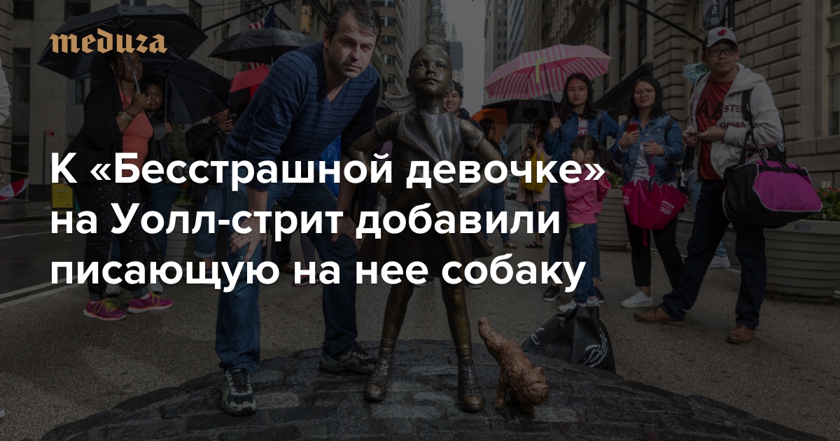 7 марта, накануне Международного женского дня, в Нью-Йорке установили статую маленькой девочки. Она с вызовом смотрит на «Быка с Уолл-стрит» — городскую скульптуру, ставшую одним из символов американской биржи. Теперь к своеобразному флешмобу присоединился еще один художник: он установил рядом с «Девочкой» бронзовую собаку, которая писает ей на ногу.