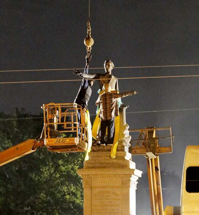 Около трех часов утра 11 мая к скверу в центре Нового Орлеана подъехали бульдозеры и строительные фургоны. Их сопровождал десяток полицейских машин. Под охраной сотрудников правопорядка строители в бронежилетах и масках, скрывающих лица, принялись разбирать памятник президенту Конфедеративных Соединенных Штатов Джефферсону Дэвису, простоявший в городе больше ста лет. К утру фигуру Дэвиса с помощью крана сняли с постамента и погрузили в грузовик, который увез памятник в неизвестном направлении.
