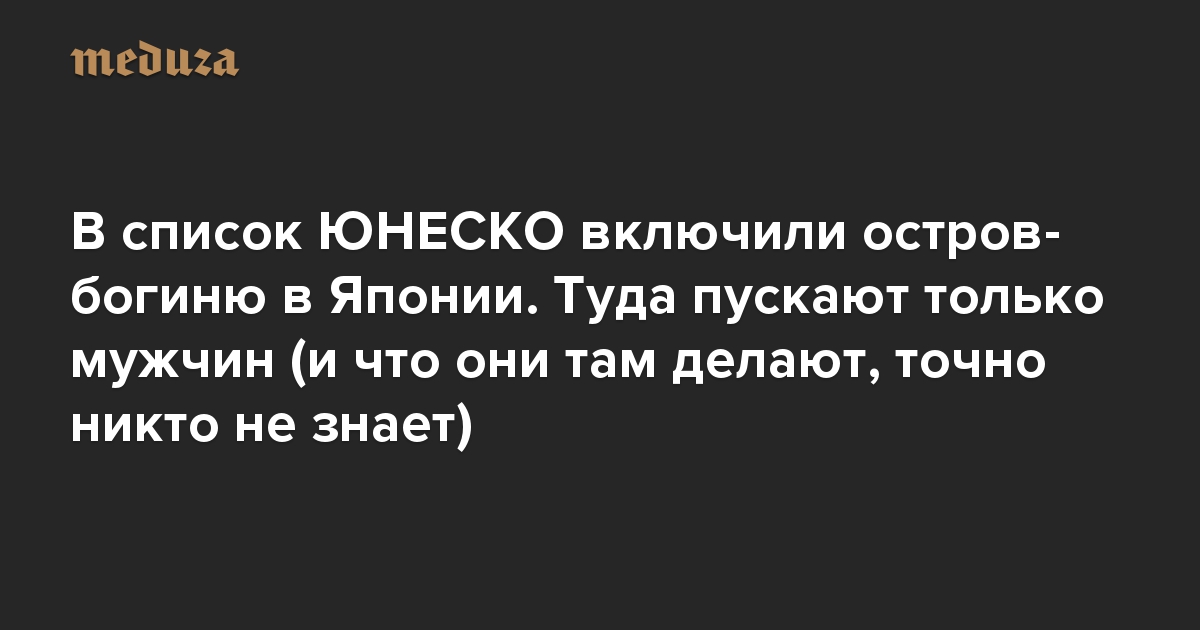 ЮНЕСКО расширило список объектов Всемирного наследия, находящихся под защитой ООН. В него добавились восемь мест, в том числе монастырь заповедника «Остров-град Свияжск» в Зеленодольском районе Татарстана, венецианские оборонительные сооружения в Хорватии и Черногории, а также коммуна Тапутапуатеа на острове Раиатеа Французской Полинезии. «Медуза» решила рассказать о самом загадочном месте, вошедшем в список, — священном японском острове Окиносима, куда пускают только мужчин. Что происходит на острове, никто не знает — всем посетившим его строго-настрого запрещается рассказывать о своем опыте.