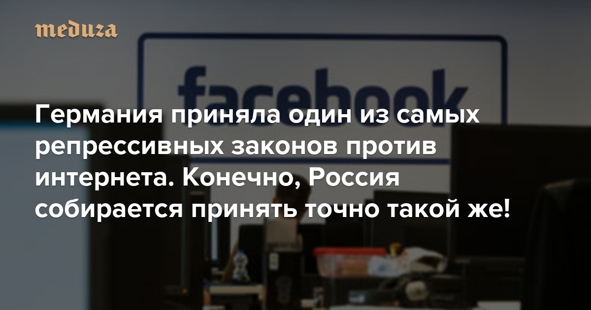 Группа депутатов от «Единой России» внесла в Госдуму законопроект, обязывающий соцсети удалять «противоправный контент» по заявлению пользователей. В случае, если соцсети не справятся с этой задачей, им грозит большой штраф. По всей видимости, документ имеет неплохие шансы стать законом — во всяком случае, уже известно, что предложение нескольких депутатов поддерживает вся фракция единоросов. Как выяснилось, законопроект до мельчайших деталей напоминает документ, принятый немецким Бундестагом в конце июня 2017 года — и раскритикованный за нарушение свободы слова. «Медуза» рассказывает о немецком документе — и пытается понять, как вышло, что парламент одной из самых развитых стран Европы принимает репрессивные законы против интернета.