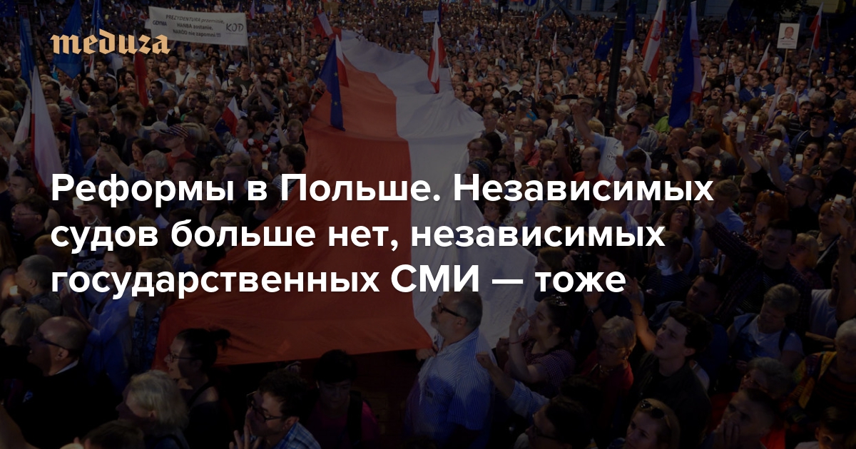 Больше недели в Варшаве и других городах Польши продолжаются митинги и протестные выступления. Оппозиционеры и многие местные жители протестуют против судебной реформы правящей партии «Право и справедливость» — она подчиняет суды польскому Минюсту, то есть фактически лишает судебную власть в Польше независимости. Это уже не первое действие правительства «Права и справедливости», резко критикуемое обществом: в начале 2016 года в Польше реформировали государственные СМИ, значительно ограничив их независимость, а несколькими месяцами позже Сейм пытался запретить в стране аборты. Оппозиция обвиняет правящую партию в попытке совершения государственного переворота, а европейские чиновники Брюсселя — в разрушении демократических институтов страны. «Медуза» коротко рассказывает о самых громких инициативах консервативного правительства Польши.