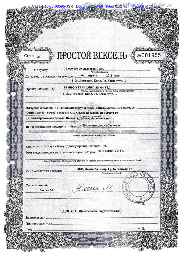 Впрочем, некоторые документы, представленные в американском суде, противоречат заявлениям партнеров по «Авилону». Так, американский юрист Варшавского сам пересылал представителю Леонтьева векселя на имя Карапетян в письме под заголовком «Подтверждение задолженности». А руководитель юридического департамента «Авилона» Виталий Попов упоминал проекты договоров, «по которым [Леонтьев и Железняк] приобретут соответствующие векселя и права требования у нынешних держателей», — и в этих проектах также есть имя Карапетян. Судьбе ее векселей даже посвящен отдельный файл KDS.pdf, который Попов пересылал финансовому директору «Авилона» Ирине Монаховой. Таким образом, как минимум юридические представители Варшавского и Авагумяна знали о существовании векселей Карапетян и пытались договориться о том, чтобы бумаги были выкуплены.