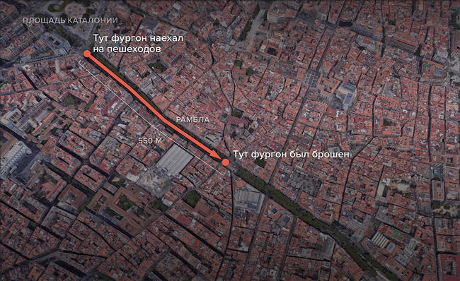 Фургон Fiat, в котором находились террористы, в четверг 17 августа около пяти часов вечера по местному времени въехал в толпу пешеходов на главной туристической улице Барселоны — Рамбле. Автомобиль двигался на скорости около 80 километров в час и не сбавлял скорость, пока не врезался в киоск напротив рынка Бокерия. По Рамбле фургон проехал почти 600 метров. Погибли 13 человек, пострадали около ста, не менее 15 из них находятся в тяжелом состоянии. Среди погибших и пострадавших — граждане как минимум 18 стран, получила травмы и гражданка России; у нее легкие повреждения, от госпитализации женщина отказалась.