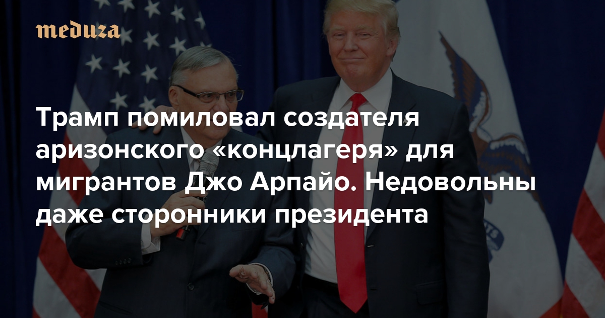Президент США Дональд Трамп помиловал бывшего шерифа округа Марикопа в Аризоне Джо Арпайо. Его признали виновным в неподчинении суду; 85-летнему шерифу грозило до полугода тюрьмы. Арпайо нарушил запрет суда на задержание мигрантов только за то, что у них нет разрешения на пребывание в Штатах, при этом шериф и его помощники целенаправленно ловили только латиноамериканцев — и помещали их в тюрьму, которую он сам называл «концентрационным лагерем». Благодаря решению Трампа Арпайо останется на свободе; противники президента говорят, что миллиардер злоупотребляет полномочиями и совершает поступок, достойный импичмента. «Медуза» рассказывает, кто такой Джо Арпайо и почему Трамп решил его освободить.