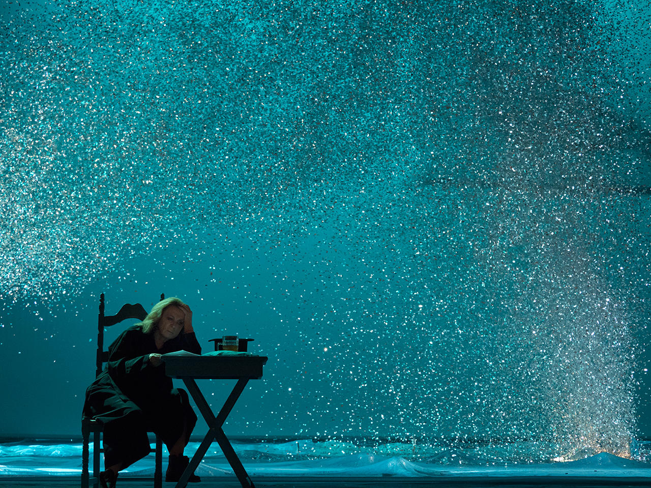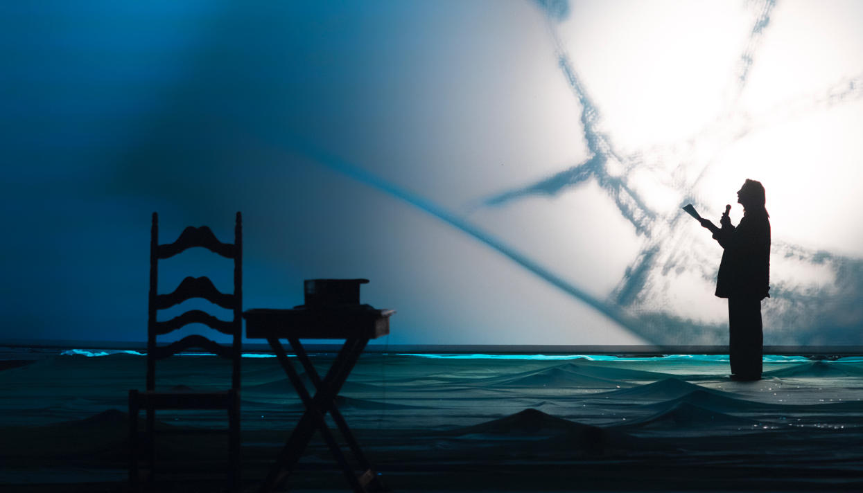 Сценография, сочиненная режиссером самолично, подхватывает аналогию между артисткой и рыбаком, уподобляя море театру (или театр — морю). Полупрозрачные голубые «паруса» то взлетают под колосники, становясь театральными падугами, то спускаются к полу многослойным занавесом. Свет в зрительном зале гаснет, когда над океаном наступает ночь, и загорается с рассветом. В кульминационный момент большая удочка тащит не рыбу, а синий «морской» ковер, покрывающий сцену, словно подмостки — и есть добыча героя.