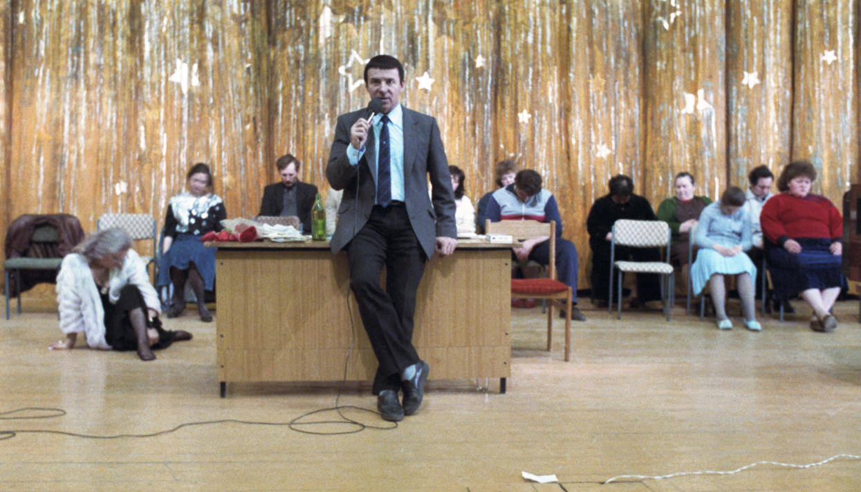 Оказавшись на сцене, Кашпировский честно старался, но «поймать волну» не смог. Неготовая вселенная — пустяки. Как сказал Роберт Фрост, ад — это полупустая аудитория. Кашпировский злился, что билеты на его выступления расходились плохо. Он привык к 300 миллионам телезрителей и 25 000 посетителей стадиона. Теперь на него пришло 300 человек. Он рассказывал о своих достижениях и теориях с натужным энтузиазмом коммерсанта, продающего в ночном телемагазине парики. Затем начались свидетельства исцеленных. У какой-то женщины прошло растяжение шеи — аллилуйя. У другой пропал ревматизм, а седые волосы потемнели: «Я чувствую себя уже не на 60, а на 30 лет», — сказала она. Выглядела она, впрочем, на все 70. Кашпировскому явно было трудно признавать собственные чудеса. Он поглядывал на настенные часы. Когда прошло достаточно времени, он объявил, что пора приступать к сеансу. Заиграла синтезаторная музыка, Кашпировский принялся урчать в микрофон. Но главный номер ему тоже не удался.