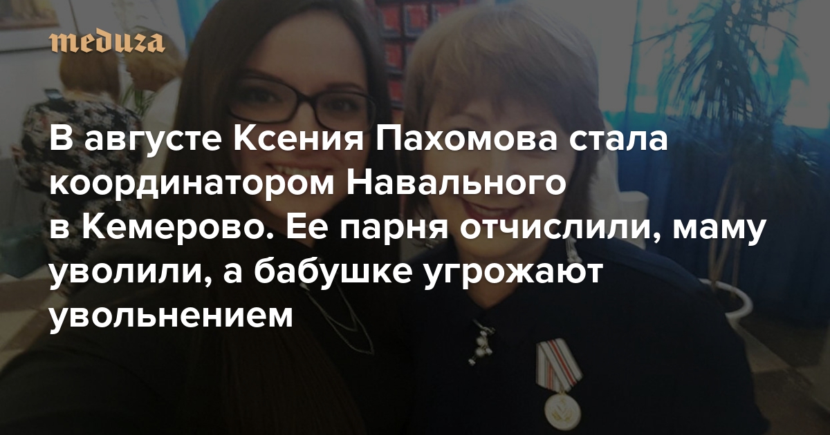 Глава кемеровского штаба оппозиционера Алексея Навального Ксения Пахомова 31 октября рассказала, что ее мать Наталья Пахомова была уволена из школы искусств № 50, где она всего за две недели до этого была назначена директором. «Маме и раньше говорили в личных беседах, что ее могут уволить за то, что ее дочь — координатор штаба Навального», — сказала «Медузе» Ксения Пахомова; координатором штаба Навального в Кемерово она работает с августа 2017 года.