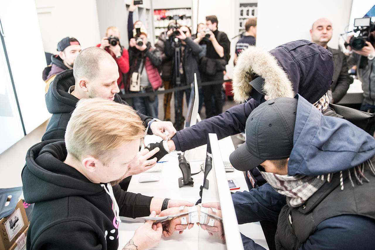 Стычки и попытки вырвать место поближе к дверям магазина продолжались вплоть до 8 часов утра. К этому моменту единая очередь у магазина окончательно разбилась на две. Первая, около 250 человек, выстроилась слева от re:Store и ждала, когда их пустят в магазин и разрешат купить новый айфон. Вторая, не меньшая по численности, стояла справа и получала браслеты. «Мы это сделали, сделали!» — восторженно кричала молодая пара, получившая право войти в магазин в конце третьей сотни покупателей.