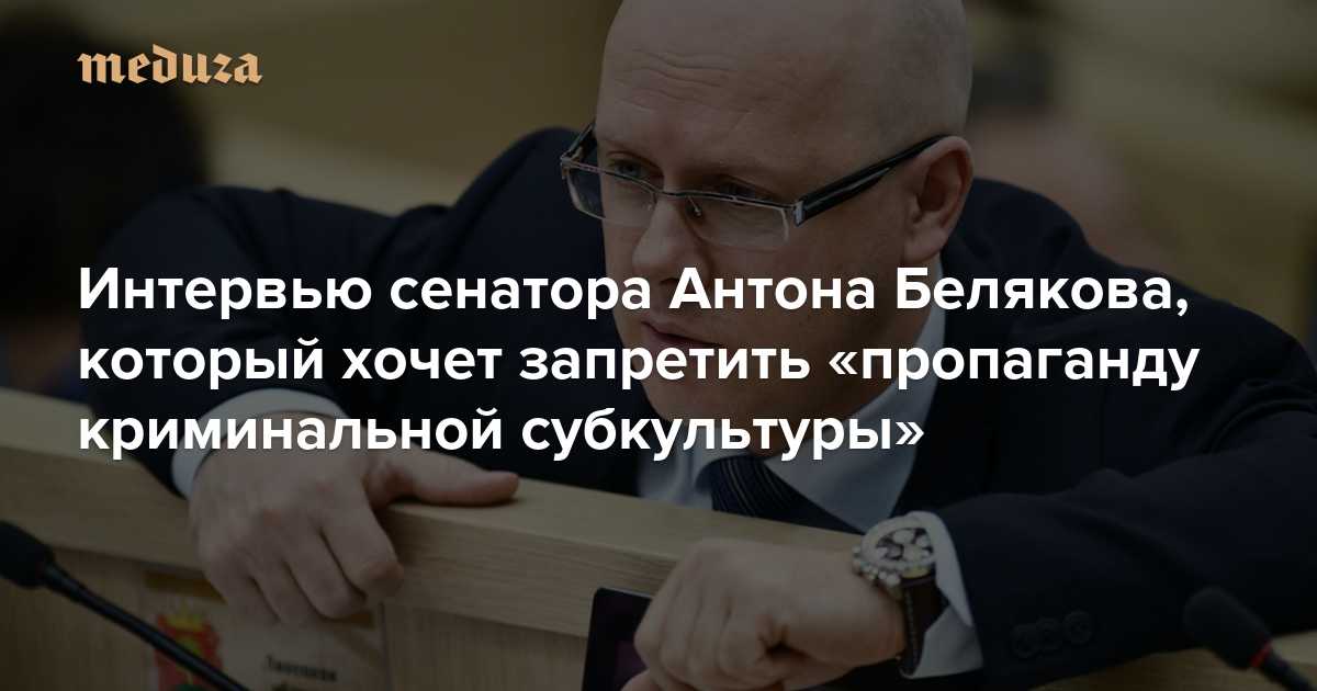 Сенатор Антон Беляков внес в Госдуму законопроект, запрещающий «пропаганду криминальной субкультуры». Под «пропагандой криминальной субкультуры» Беляков предлагает понимать распространение «информации о ценностях преступного мира», которая формирует «привлекательность криминального образа поведения». Законопроект наделяет Роскомнадзор правом во внесудебном порядке блокировать интернет-страницы с таким контентом. Журналист «Медузы» Павел Мерзликин поговорил с Беляковым.