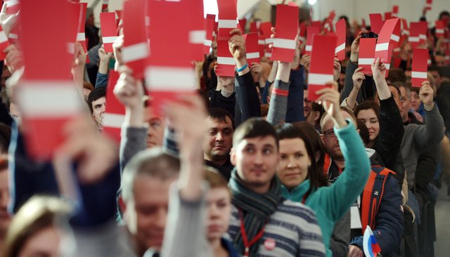 Официальную часть собрания вел руководитель юридического отдела Фонда борьбы с коррупцией Иван Жданов. Он объяснил, что по российскому законодательству участники собрания должны проголосовать по четырем вопросам: три из них носят организационный характер, еще один касается, собственно, выдвижения Навального в качестве кандидата на выборы президента в 2018 году. За то, чтобы поддержать политика, проголосовали 742 человека; противников и воздержавшихся не оказалось (по закону поддержать самовыдвиженца должны минимум 500 человек). Зал поделили на секторы — по ним и вели подсчет голосов, отмечая поднятые над головой мандаты (небольшие красные листы). Голосование по каждому вопросу длилось не менее трех минут, участники начали шутливо жаловаться на затекшие руки, которые они не могли опустить до окончания подсчета.