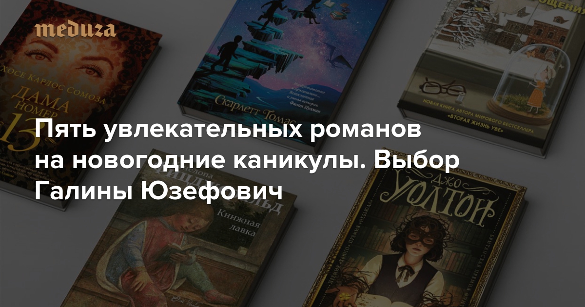 Литературный критик «Медузы» Галина Юзефович рассказывает о пяти романах для необременительного, но захватывающего чтения на новогодних каникулах: «Бабушка велела кланяться и передать, что просит прощения» Фредерика Бакмана, «Драконий луг» Скарлетт Томас, «Книжная лавка» Пенелопы Фицджеральд, «Дама номер 13» Хосе Карлоса Сомозы и «Среди других» Джо Уолтон.