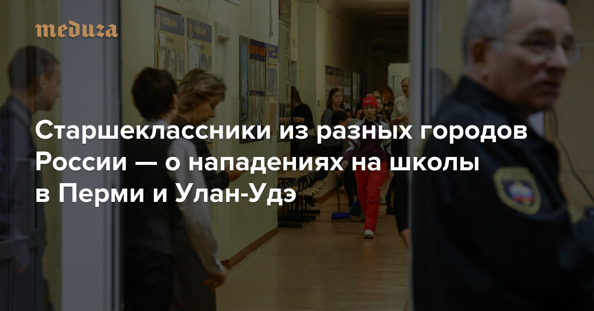 В течение одной недели в двух городах России — в Перми и в Улан-Удэ — старшеклассники с холодным оружием напали на учителей и других школьников. Почему они это сделали, точно не известно, но, по предварительным версиям, и в том и в другом случае подростки мстили — за отчисление и за двойку в четверти. В сентябре 2017 года похожее нападение произошло в подмосковной Ивантеевке. «Медуза» поговорила со старшеклассниками из разных городов России о том, как они обсуждают произошедшее, что думают о нападениях и не боятся ли они их.