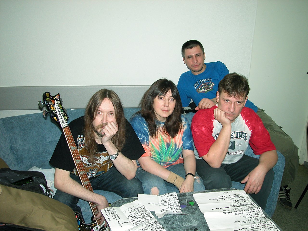 А вторая фотография — это Екатеринбург, последний концерт, мы в гримерке пишем список песен. Это делалось так: садились, брали большой основной список, где было много всего, что мы в принципе играем, — и что-то выбирали. Тут, кажется, взяли список из Уфы — что-то добавили, что-то вычеркнули. У нас с Егором был очень похожий почерк — я до сих пор иногда путаю и только по каким-то мелочам могу понять, где он, где я.