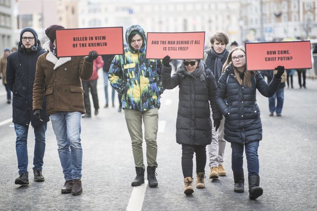 Екатерина идет с правой стороны колонны, она пришла на марш с приятелем. «С тех пор как Немцова убили, я получила неформальный абонемент на подобные митинги, — рассказывает она. — Мы с Немцовым одногодки, он был нашим человеком, борцом. Мой долг — поддержать его дело хотя бы тем, что прийти на этот марш и показать властям, что идеи Немцова живы среди нас даже сейчас».