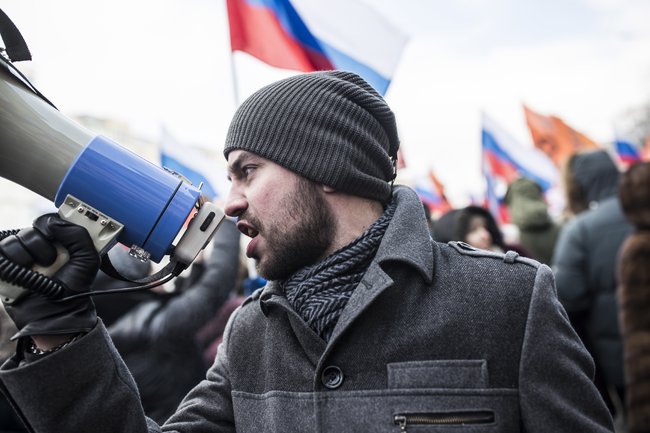 Из разных концов толпы время от времени можно было услышать тезис, который тут же подхватывали другие марширующие. «Путин — враг народа!», — зазывно кричит женщина в норковой шубе и меховой шапке, идущая под руку с мужчиной. Толпа поддерживает ее и около шести раз хором повторяет это высказывание. «Немцов — герой России», — кричит из середины толпы невысокая женщина в синем пуховике и красной шапке. Услышавшие ее мужчины громко скандируют произнесенную ей фразу.
